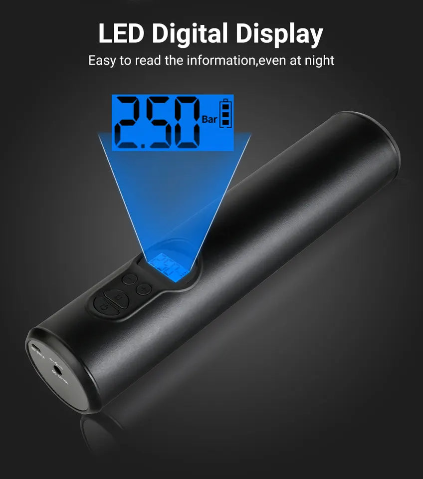 - The wireless design and compact mini size make the air compressor portable and easy to operate with one hand. The compressor is ready in only 4 steps. An LCD display indicates the air pressure. Suitable for inflating when the car tires are insufficient and fully inflating the bicycle and motorcycle tires.